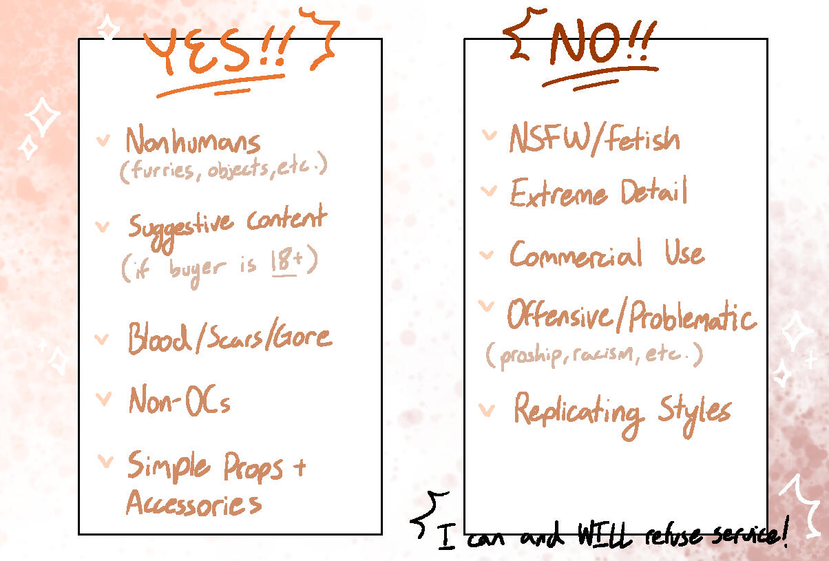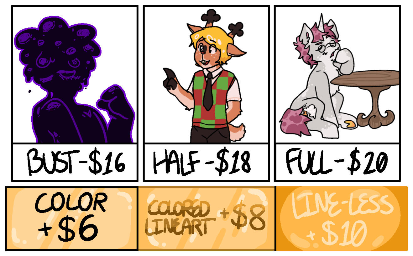 i accept payment through ko-fi, paypal, and venmo ONLY!if you do end up commissioning me, i'll have you pay after the initial sketch is to your liking. PLEASE do not send money BEFORE or AFTER this stage!!!every additional character is +50% of the original (single character) price!dm me on twitter or discord for more information!
